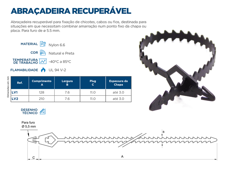 Usada principalmente na amarração e organização de fios e cabos, e em outras diversas outras finalidades por ser um produto versátil.